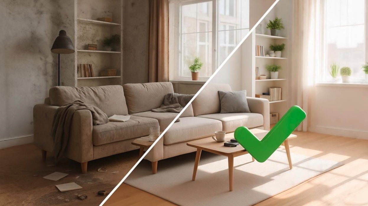 A living room and common areas checklist in Denver focuses on dust, static, and soft surfaces.